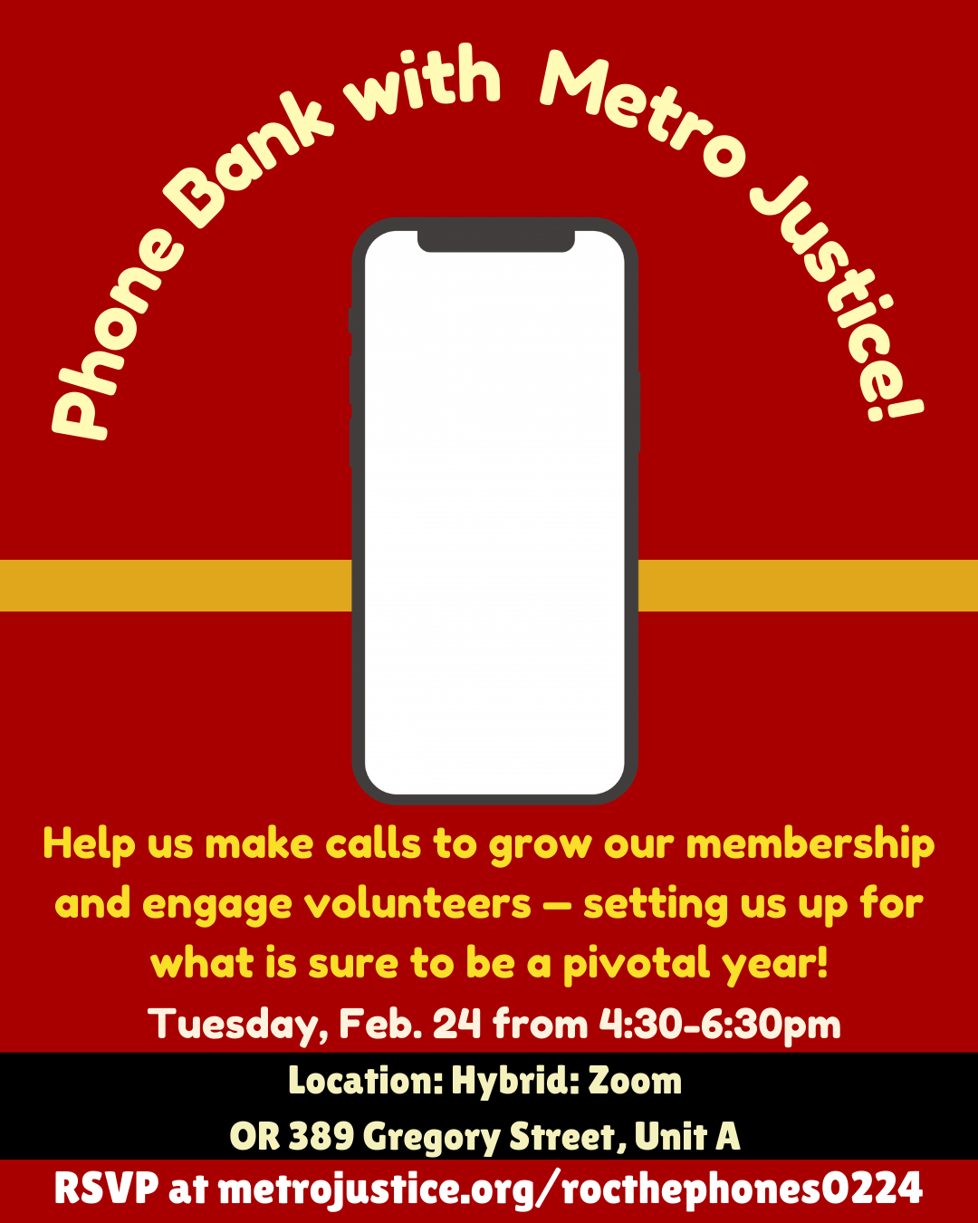 Tuesday (TOMORROW), February 24 4:30-6:30 Enjoy making friends and chatting with like-minded people? Join the Metro Justice phone bank to touch base with other members